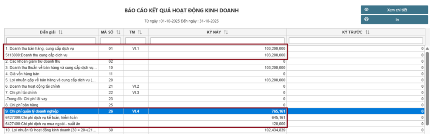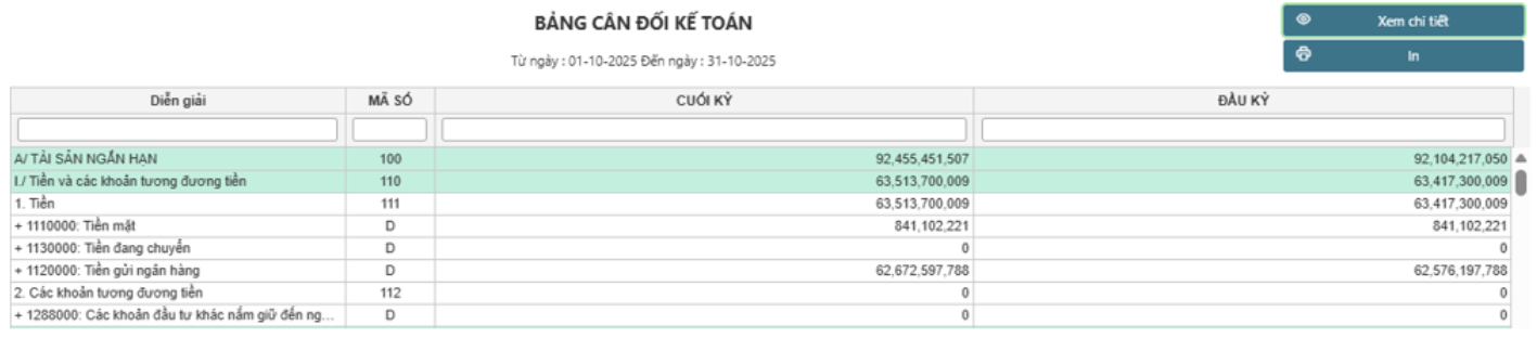·       Với lưới dữ liệu đang hiện chi tiết sẽ in báo cáo với số liệu chi tiết tài khoản.