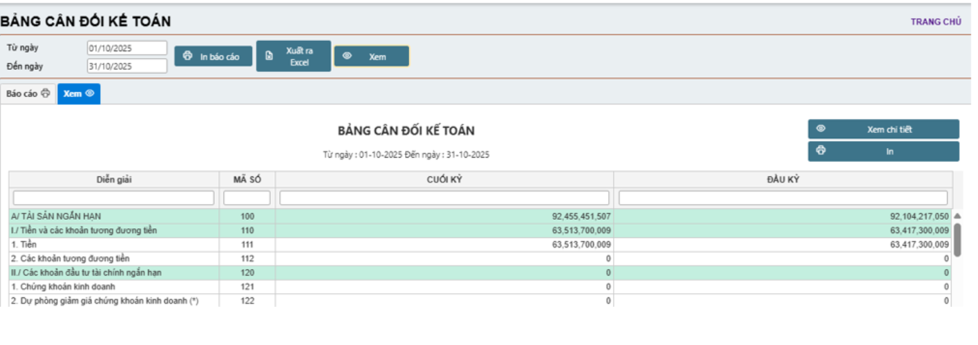 ·       Chọn Xem trên giao diện, Chọn In báo cáo dưới dạng PDF hoặc chọn Xuất ra excel.