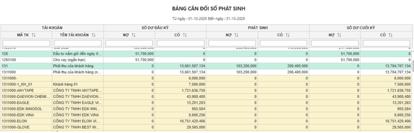 Các tài khoản công nợ (131,331,138,338) khi click đúp sẽ hiện thông tin công nợ theo đối tượng.