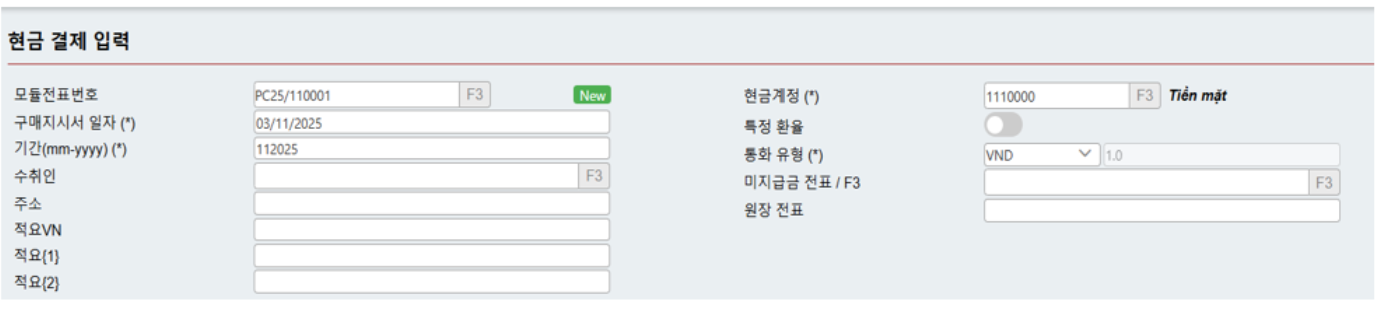 &#x20;          o   현금계정(Cash account): F3을 눌러 목록에서 선택하거나 현금계정을 입력합니다.