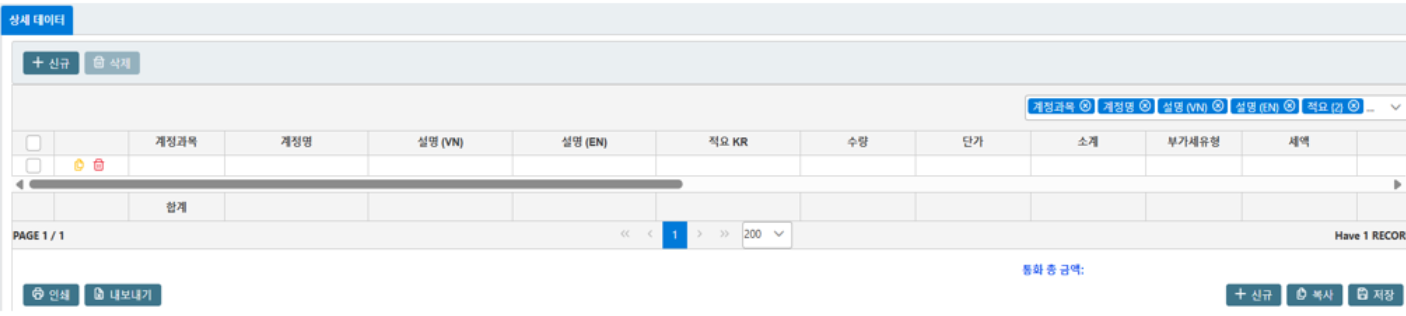 &#x20;          o   세금/ 환산 세금 금액: 세금 금액을 입력하고, 환산 세금 금액은 환율을 곱한 후의 금액입니다.