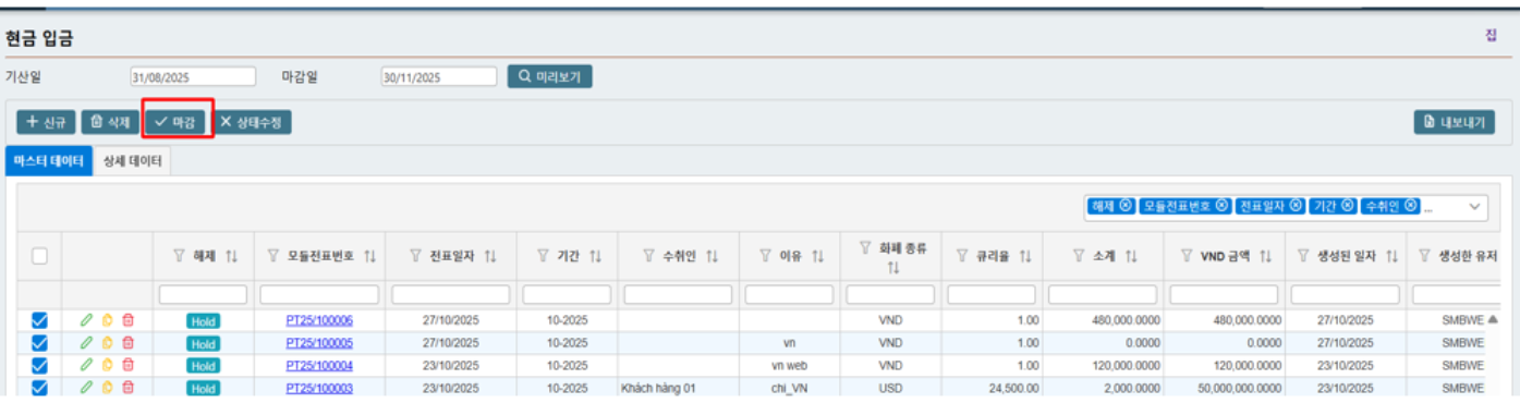 &#x20;         o   전표 목록에서 마감할 전표를 선택합니다.