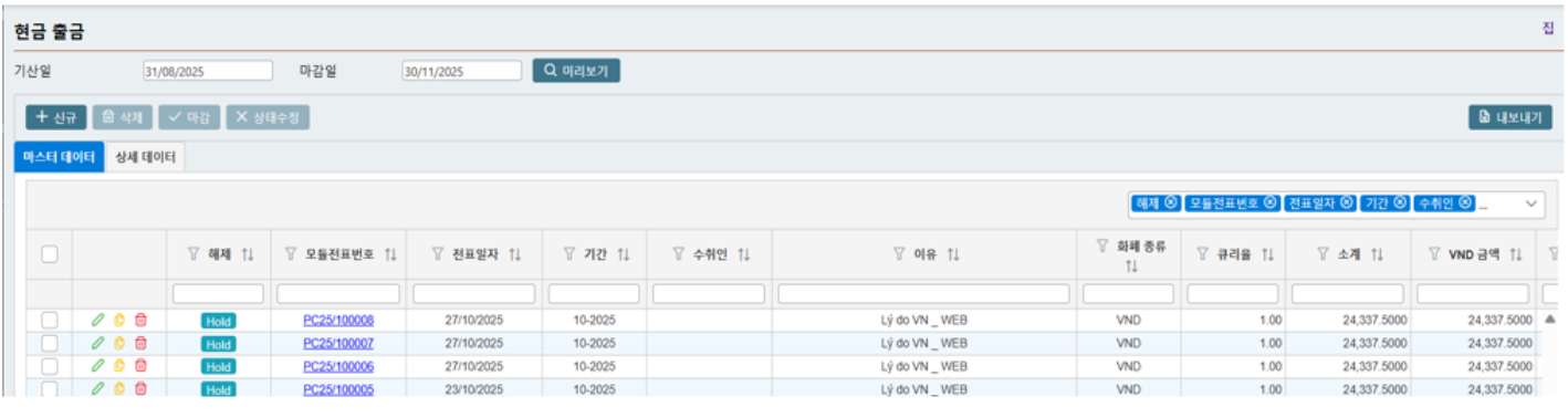 이 모듈은 이미 회계 처리된 현금 입/출금 분개를 마감하고 총계정원장으로 이관하는데 사용됩니다. 처리 절차는 외상매출금/외상매입금 회계 모듈(AP)의 전표 마감 절차와 유사합니다.