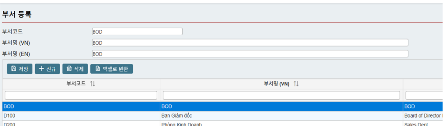 “신규”를 선택하여 새로운 “부서코드”와 “부서명(EN, VN)”을 입력하고, “저장”을 클릭합니다.