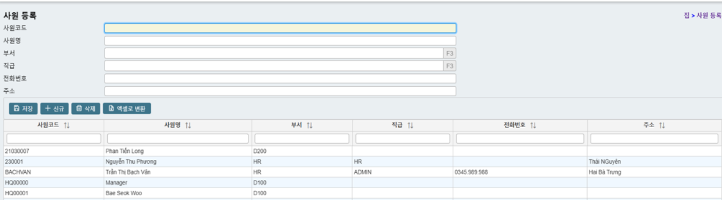 사원 정보(사원코드, 사원명, 부서, 직책, 전화번호, 주소)를 입력하여 “저장” 버튼을 클릭합니다.