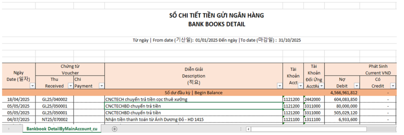 은행장부 상세내역과 같이, 외화기준 은행장부 상세내역에는 VND로 환산된 금액에 해당하는 외화 열이 추가로 표시됩니다