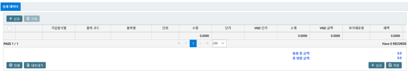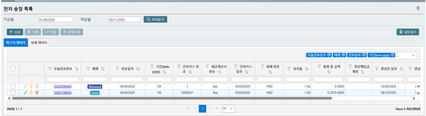 입력된 전자세금계산서의 목록을 조회할 수 있으며, 검색·추가·삭제·수정 및 신규 작성이 가능합니다.