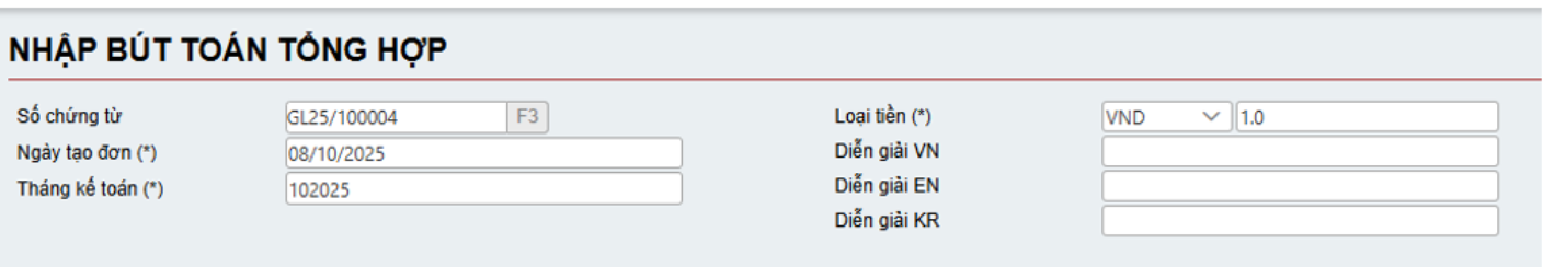 o Diễn giải (VN), (EN) và (KR): Tự động xuất hiện theo diễn giải của phần thông tin nghiệp vụ. Người sử dụng có thể thay đổi diễn giải chi tiết bằng cách nhập trực tiếp.
