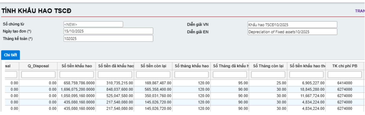 Để tính khấu hao tự động theo kỳ, chọn Tính khấu hao TSCĐ để mở màn hình nhập bút toán